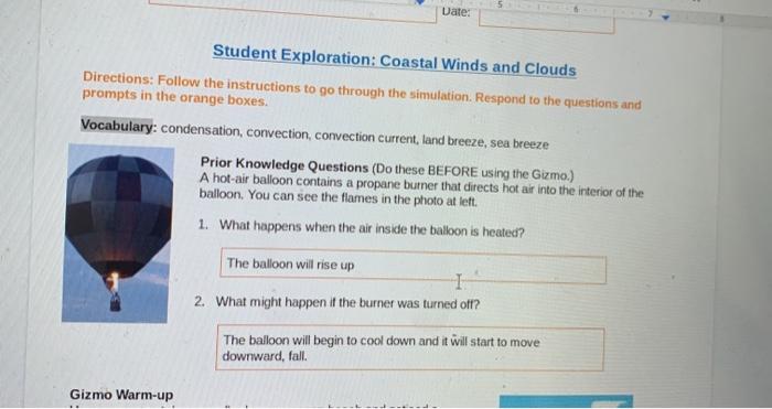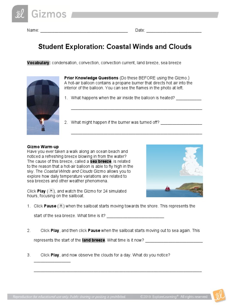 Gizmo Coastal Winds And Clouds Answer Key. Condensation convection convection current land breeze sea breeze Prior Knowledge Questions Do these BEFORE using the Gizmo A hot-air balloon contains a propane burner that directs hot air into the interior of the balloon. Showing top 8 worksheets in the category - Gizmo Weather Map.